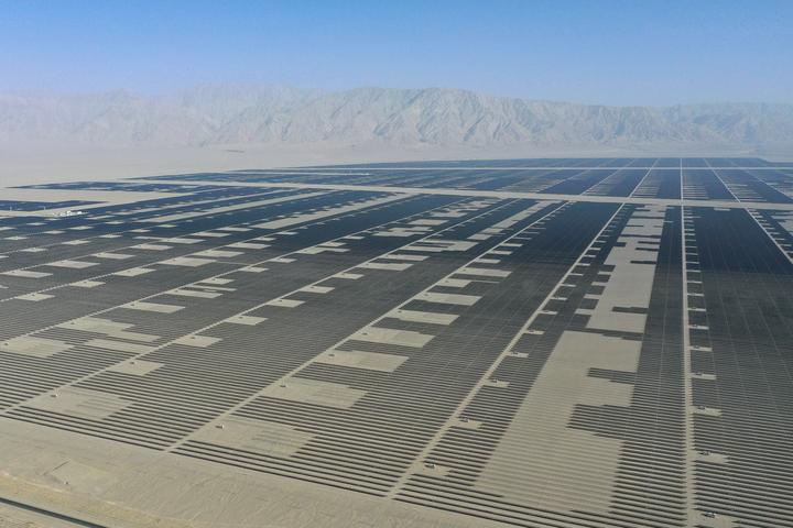 這是6月26日拍攝的中國綠發(fā)新疆中綠電若羌400萬千瓦光伏項(xiàng)目(無人機(jī)照片)。 新華社記者 丁磊 攝
