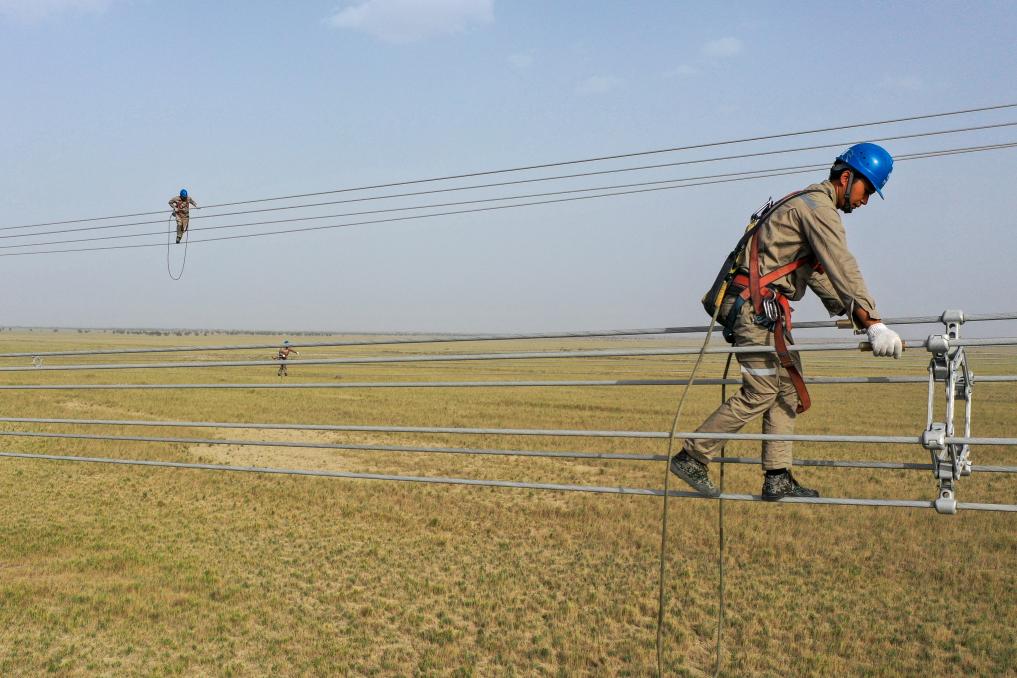 7月13日,在塔克拉瑪干沙漠南緣,最后一段電線被轟鳴著的牽引機(jī)拽著,從183號鐵塔出發(fā),掠過和若鐵路和國道315線,最終牢牢錨定在188號鐵塔上。
