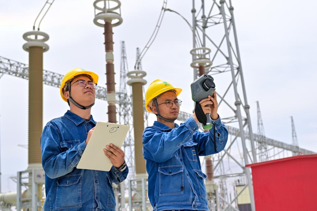在新疆環(huán)塔里木盆地750千伏輸變電工程若羌750千伏變電站,運(yùn)檢人員檢測設(shè)備溫度(6月27日攝)。新華社記者 丁磊 攝